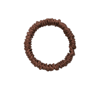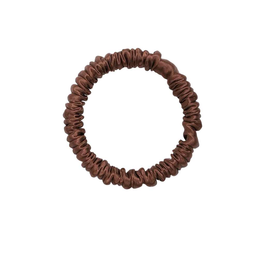 Warm brown mini silk scrunchie in 19 momme fabric, 1cm wide, designed to keep hair secure without pulling or tangling.