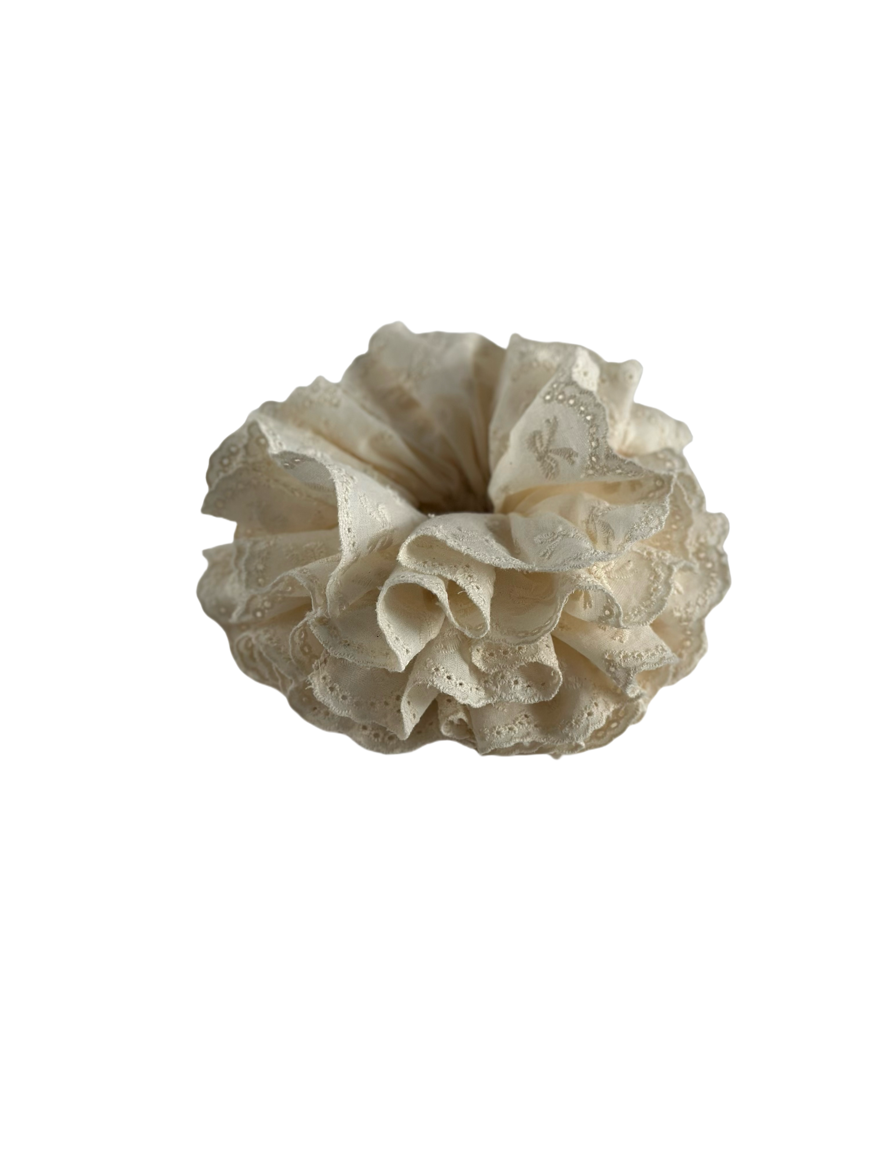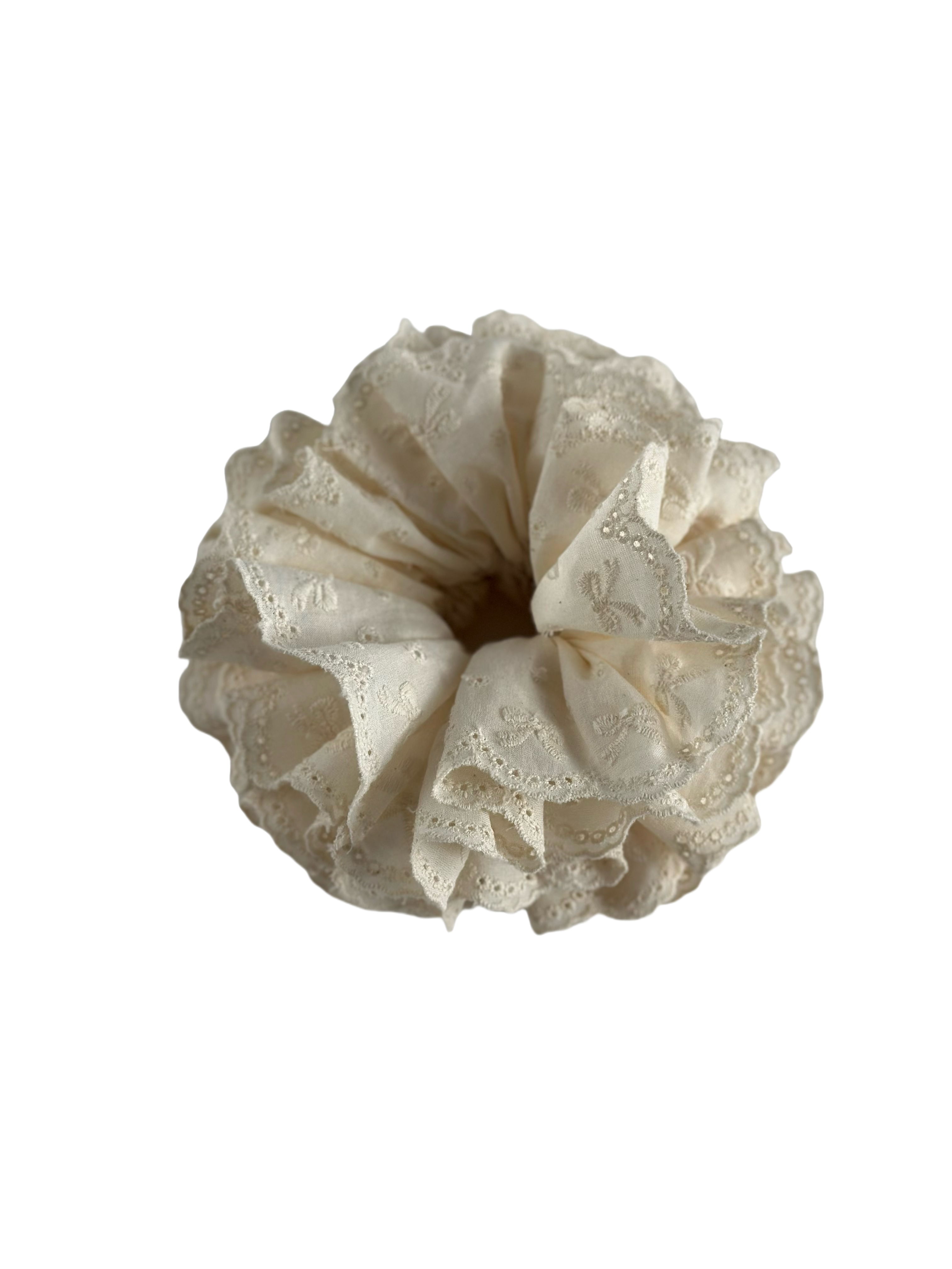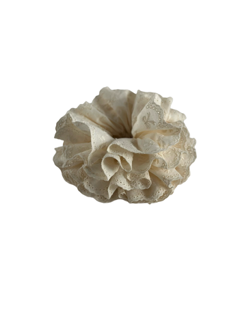 Cream four-layer lace scrunchie in a neutral tone that complements any outfit with elegance.