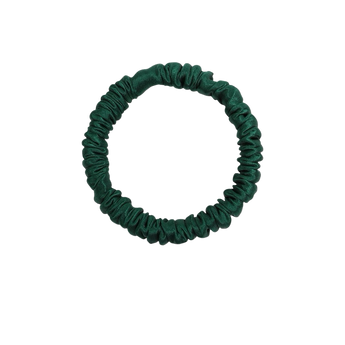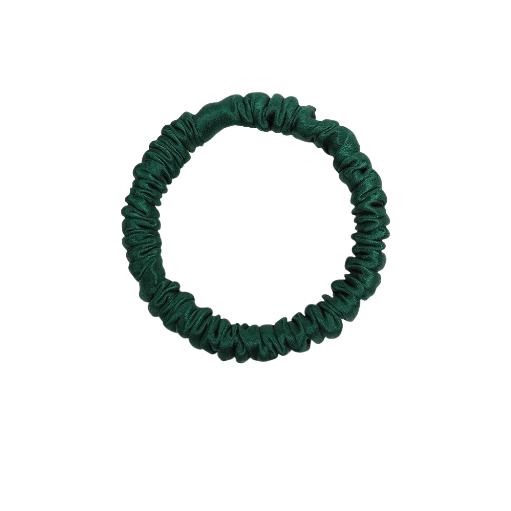 Elegant dark green 19 momme silk scrunchie, 1cm width, offering a secure hold with a luxurious, hair-friendly texture.