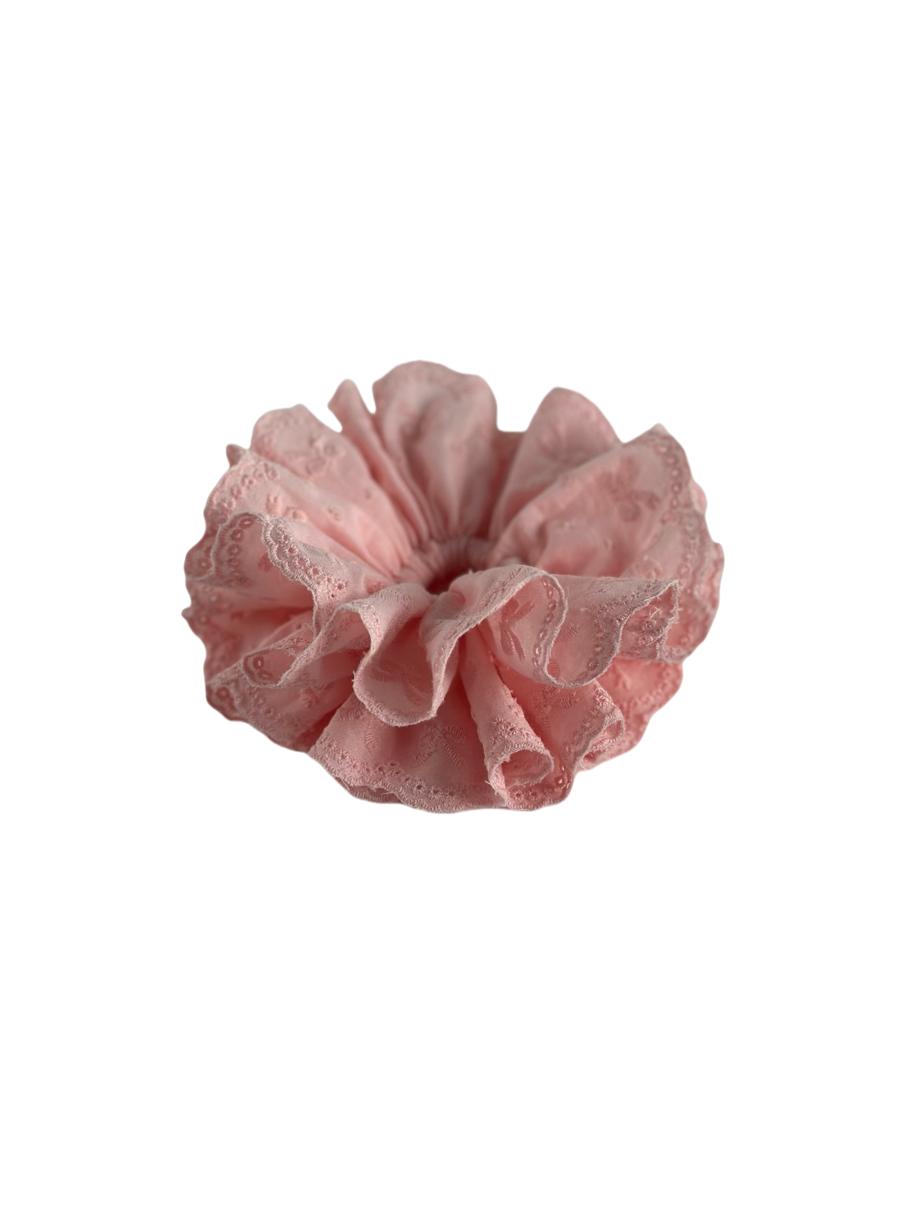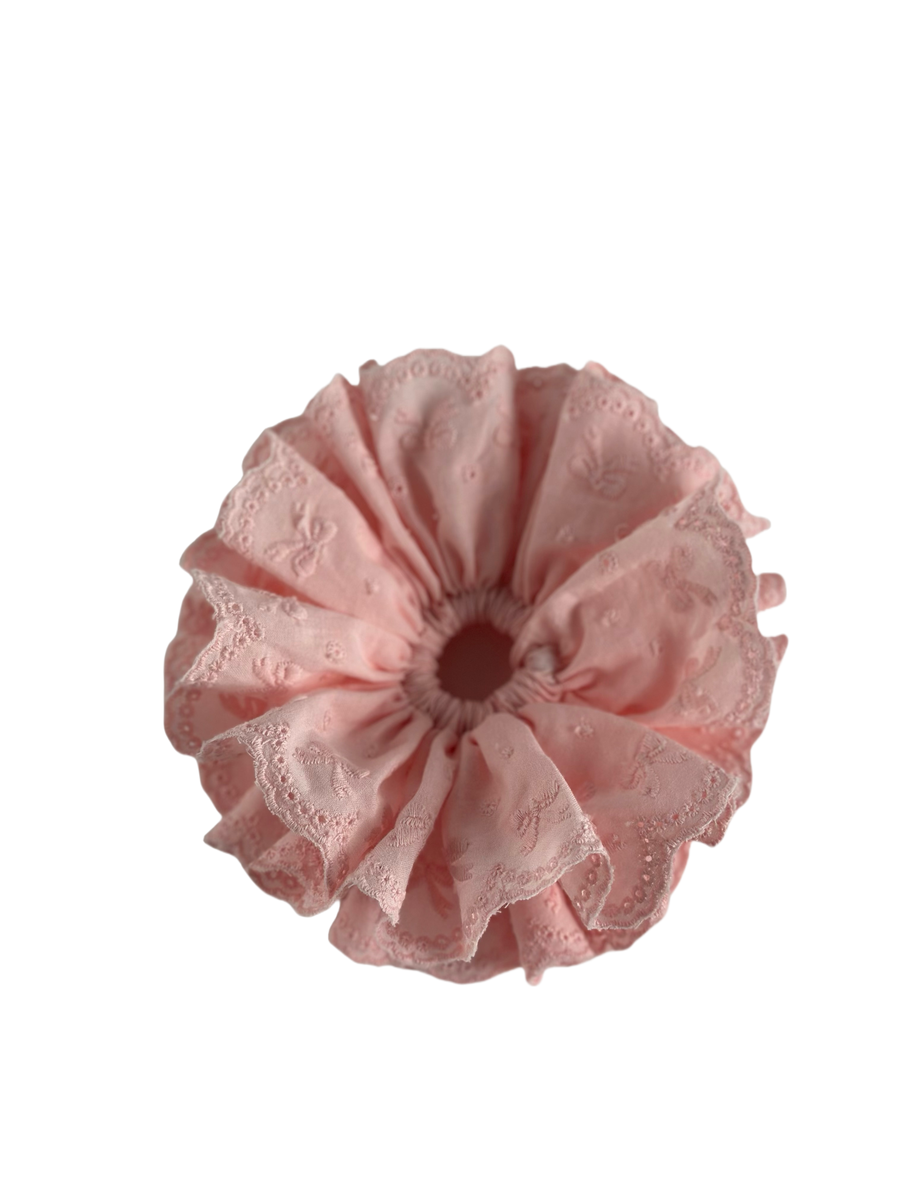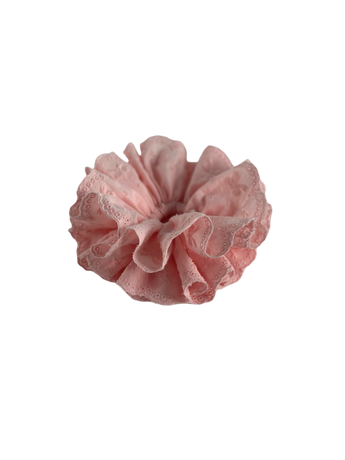 Pink two-layer lace scrunchie with a light, airy design, perfect for everyday wear with a soft touch.