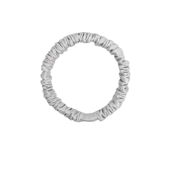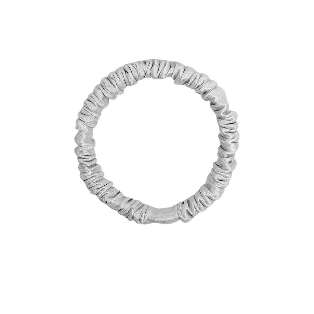 Shimmering silver 19 momme silk scrunchie, 1cm wide, offering a sleek, modern look while protecting your strands.