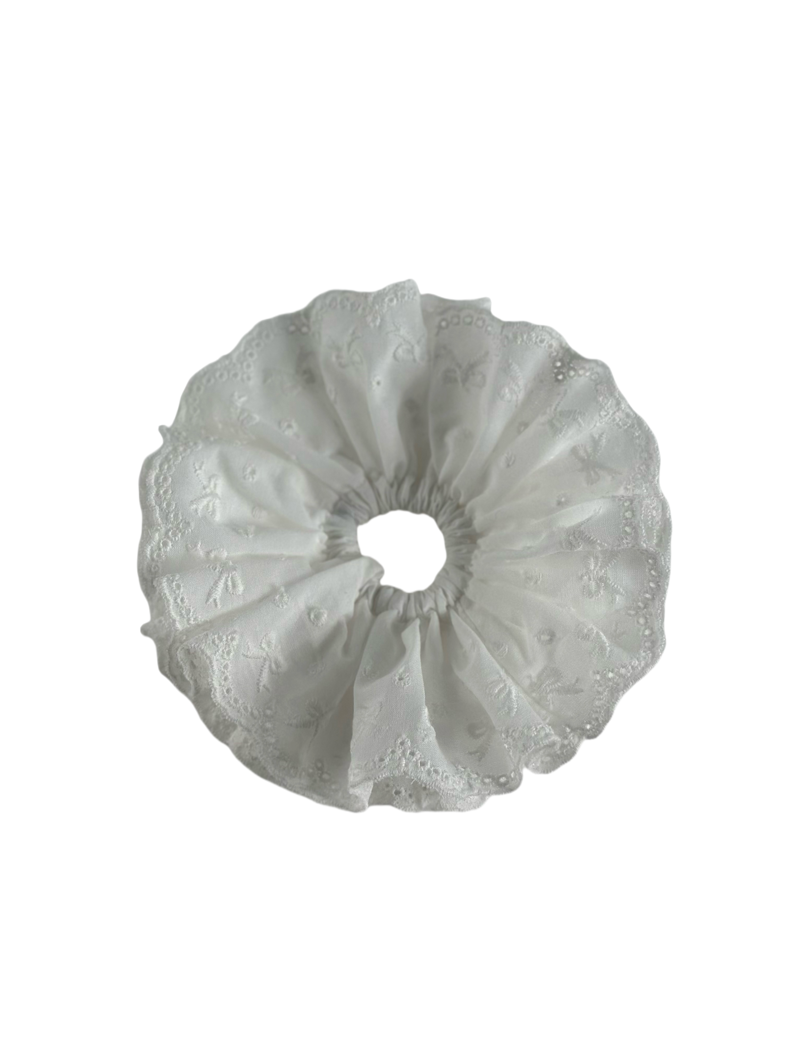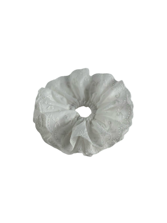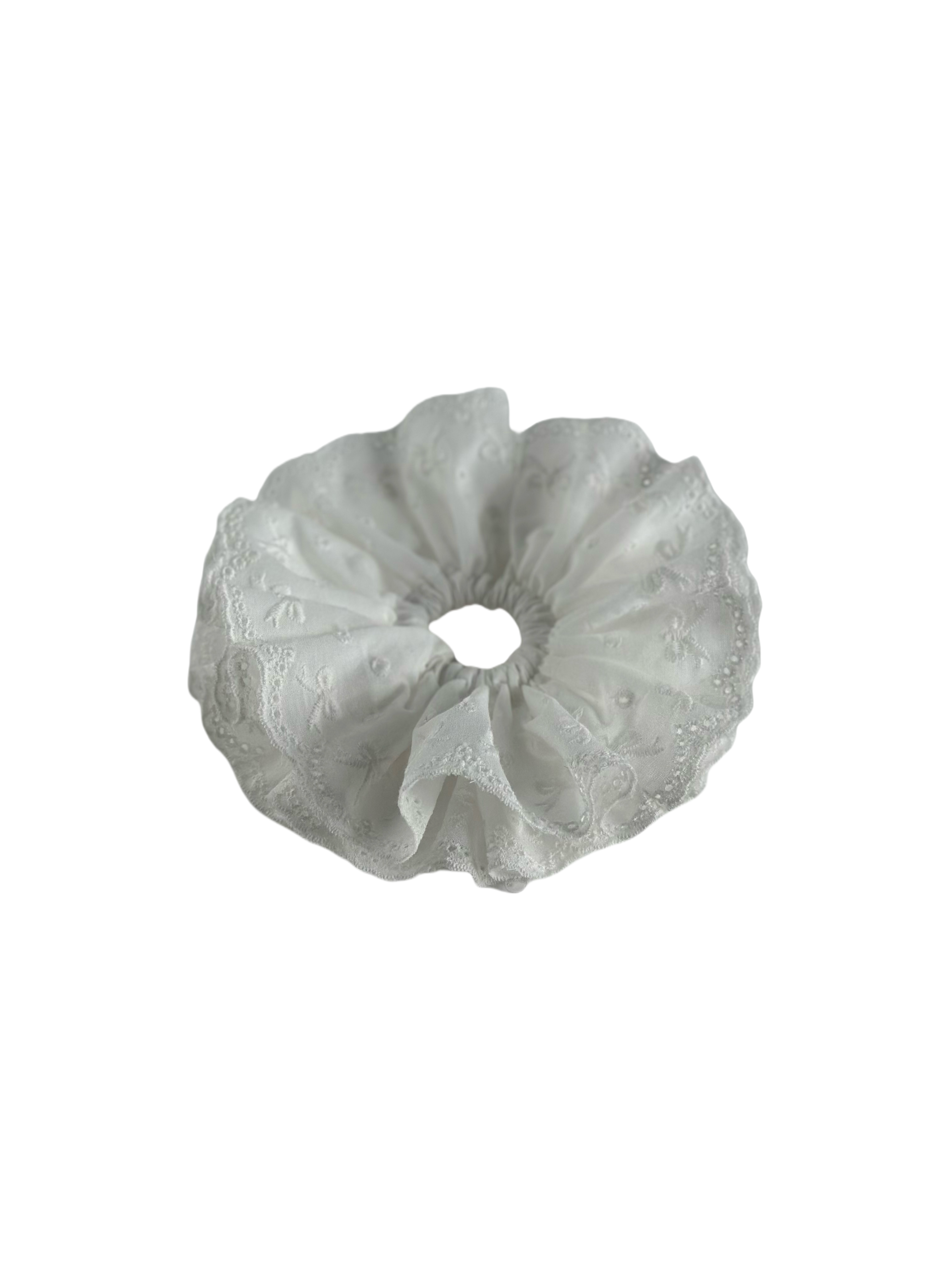White two-layer lace scrunchie for a timeless, elegant look suitable for any occasion.